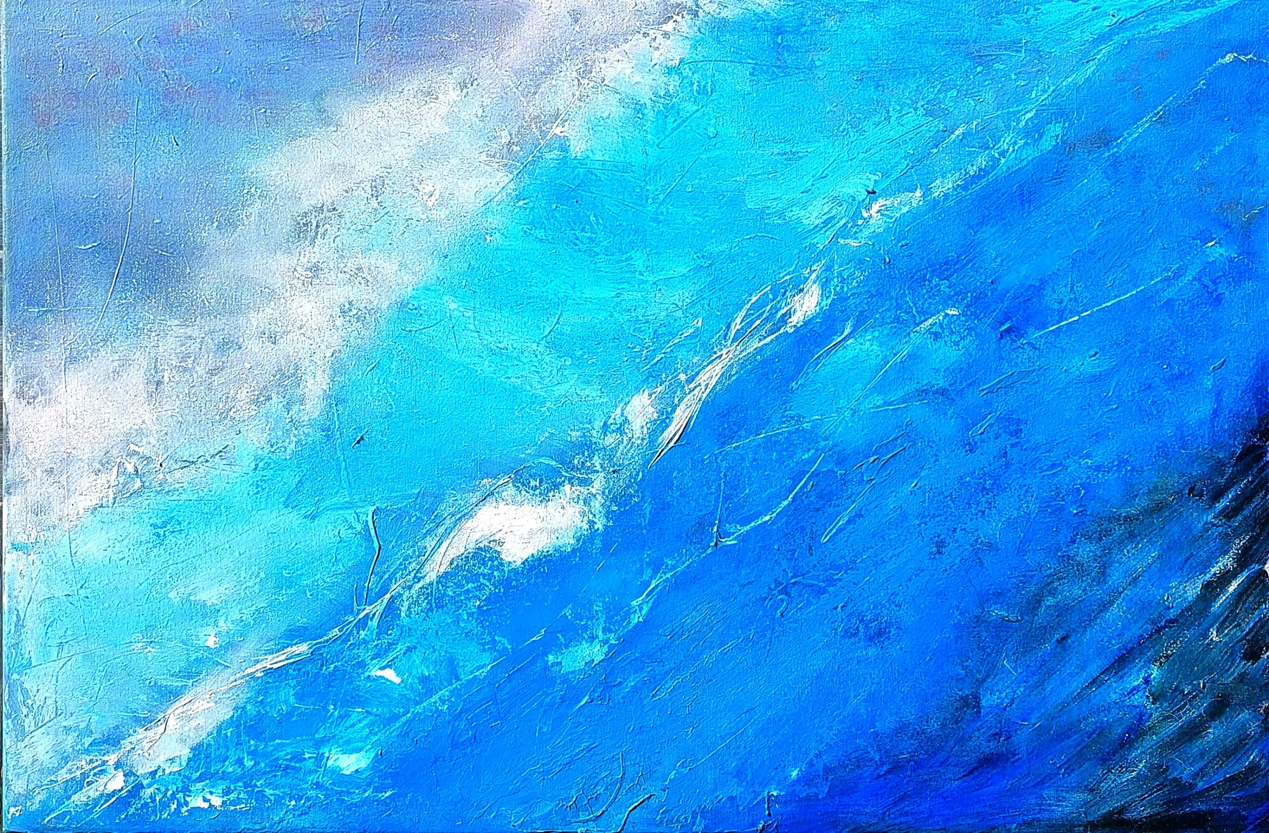 From deep sea to shallow waves, layered blues meet the foamy shore in a rhythmic coastal dance.
