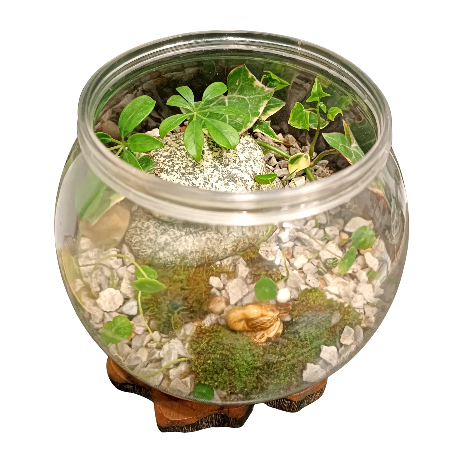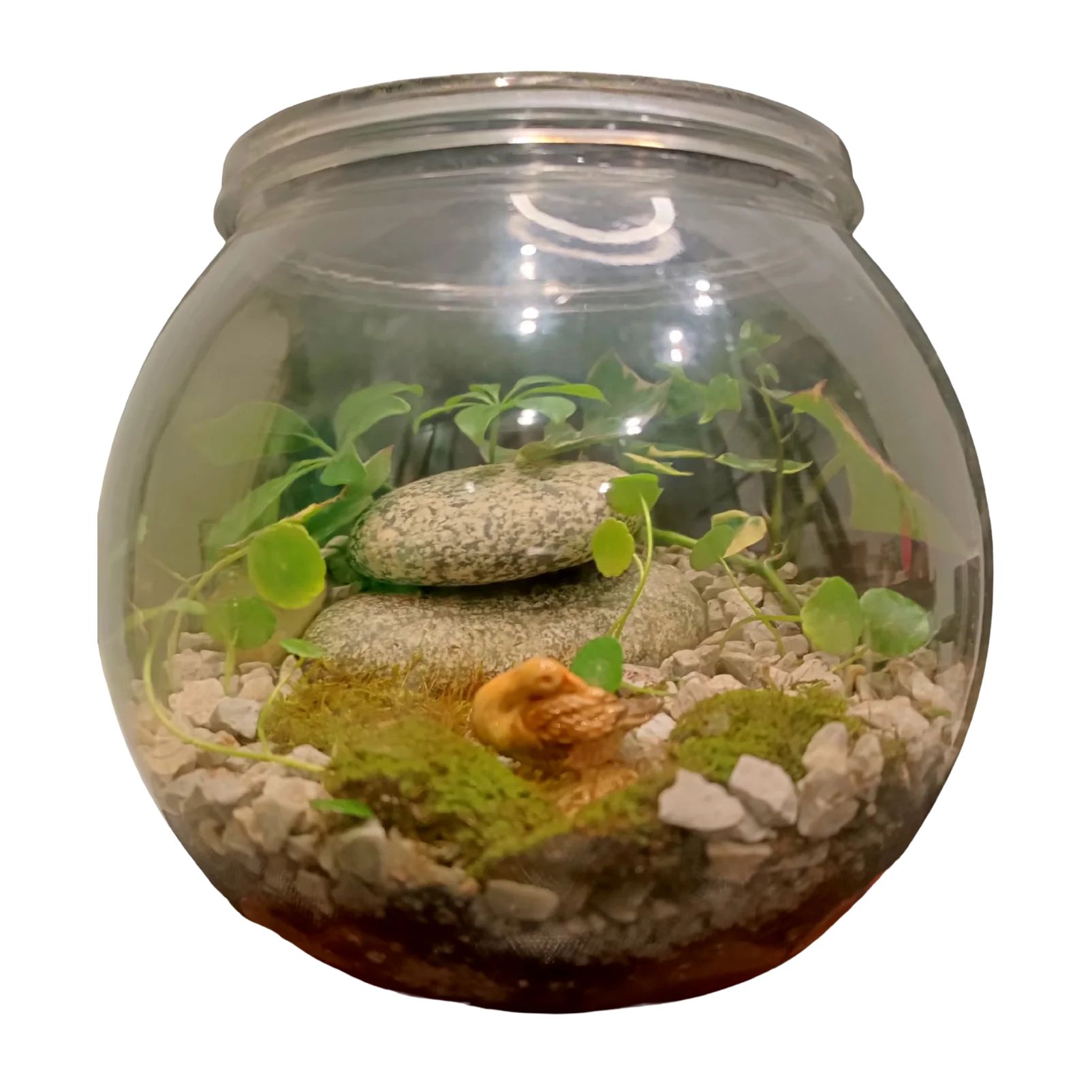 A charming closed terrarium styled like a peaceful forest nook, featuring delicate trailing plants, soft green moss, and layered natural stones. A small bird figurine rests at the center, adding warmth and life to the scene, while white pebbles and earthy soil create depth and balance. This miniature ecosystem brings a sense of calm, nature, and quiet storytelling to any space.