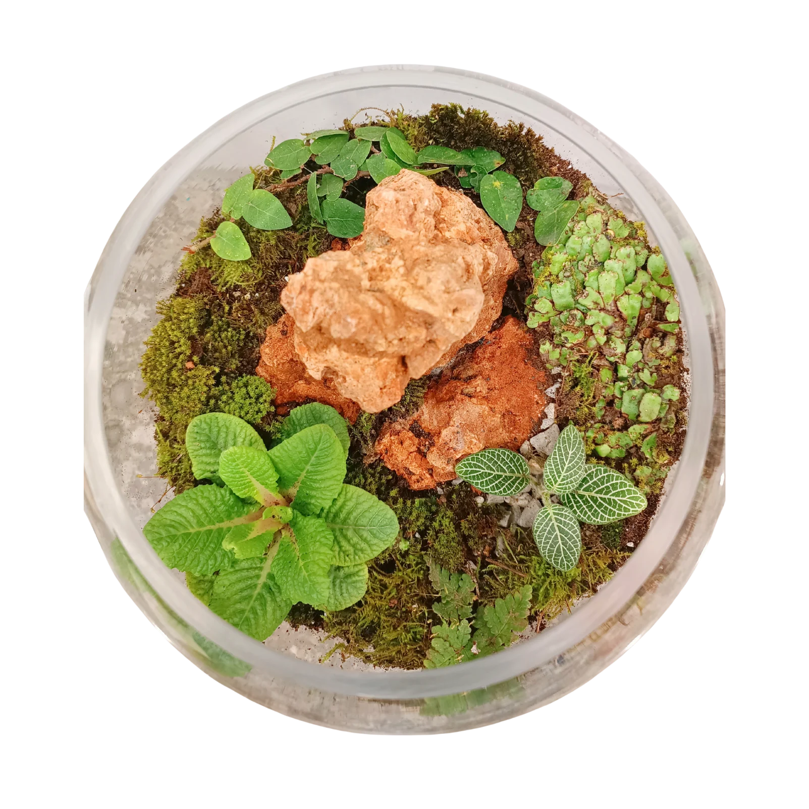 A compact glass bowl terrarium featuring lush green foliage, soft moss, and delicate fittonia leaves, centered around warm, earthy stone accents. The layered textures create a calm, natural landscape that feels like a miniature forest captured in glass.