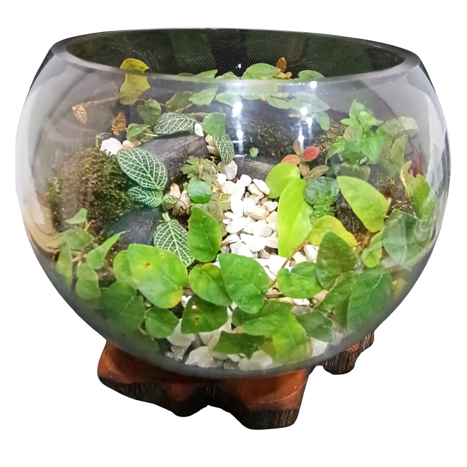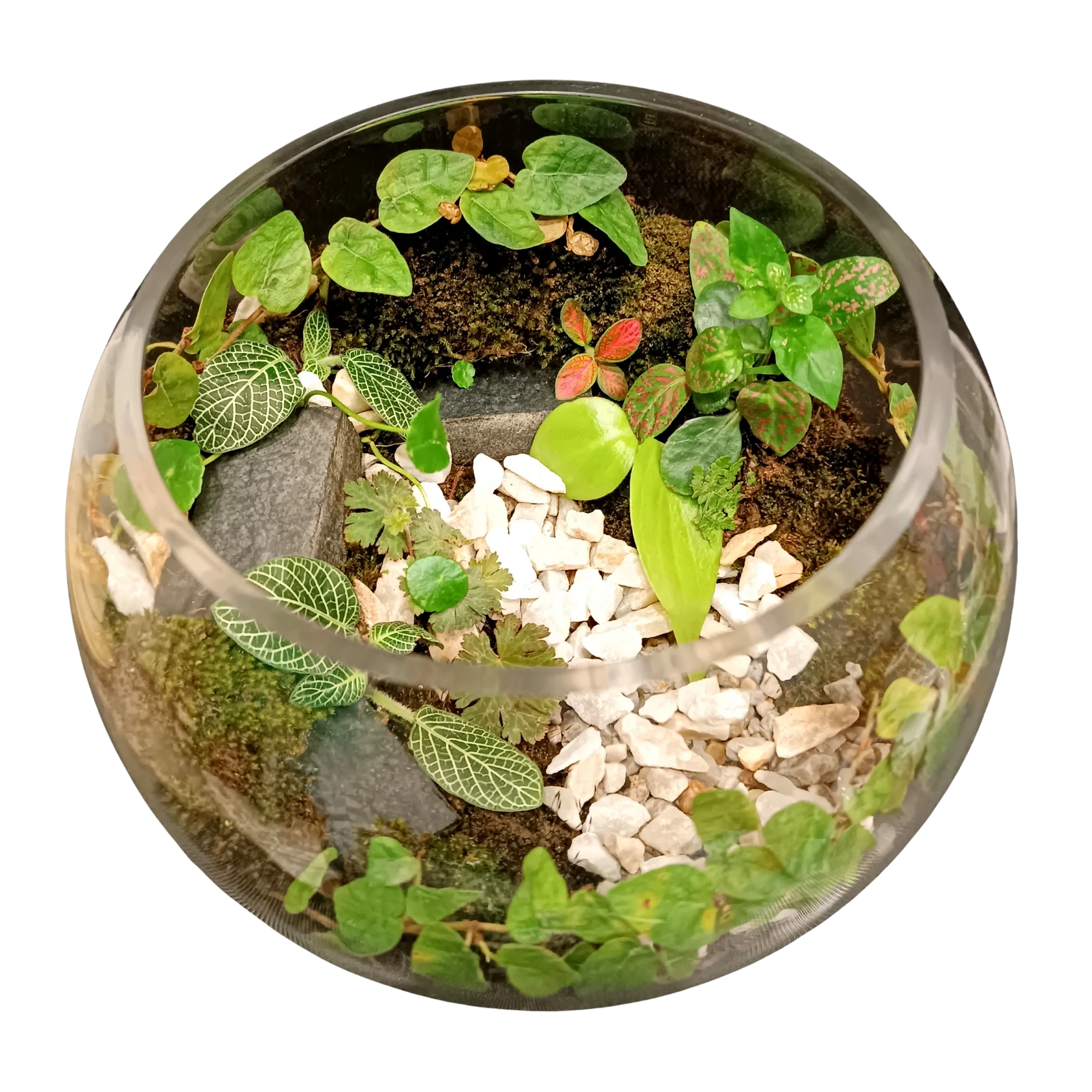 A lush closed-glass terrarium featuring a harmonious mix of fittonia and trailing green ivy, layered with natural moss, rich soil, and white decorative stones. Designed like a miniature forest bowl, it brings a calm, fresh touch of nature indoors and works beautifully as a tabletop or desk accent.