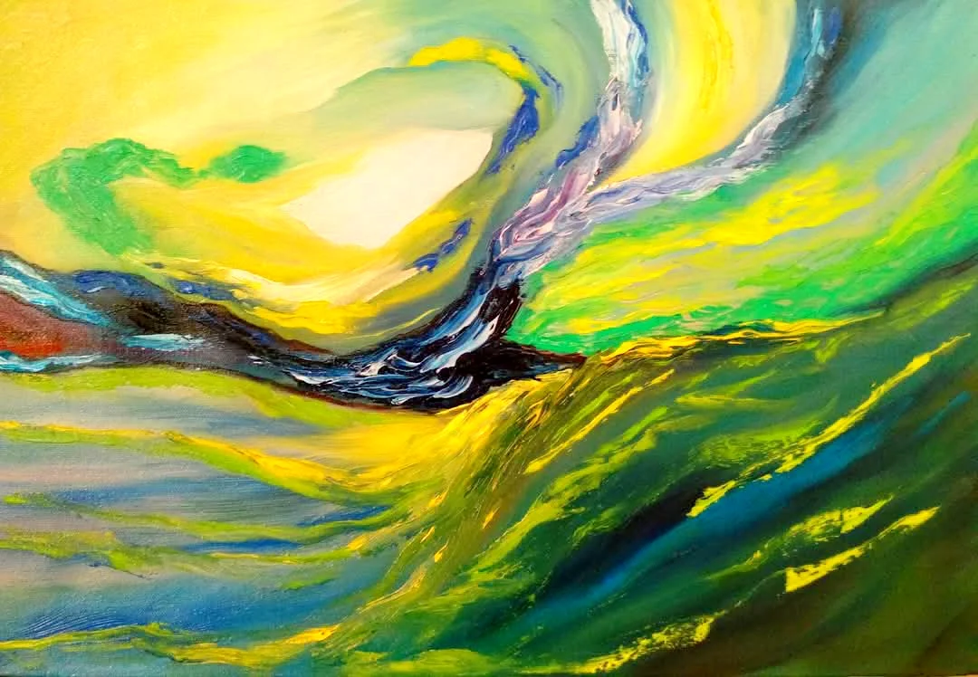 A vibrant painting where yellow, green, and blue colors flow together naturally. Bold brushstrokes create movement and energy, giving the scene a lively yet balanced feel. The artwork feels bright, calm, and full of life.