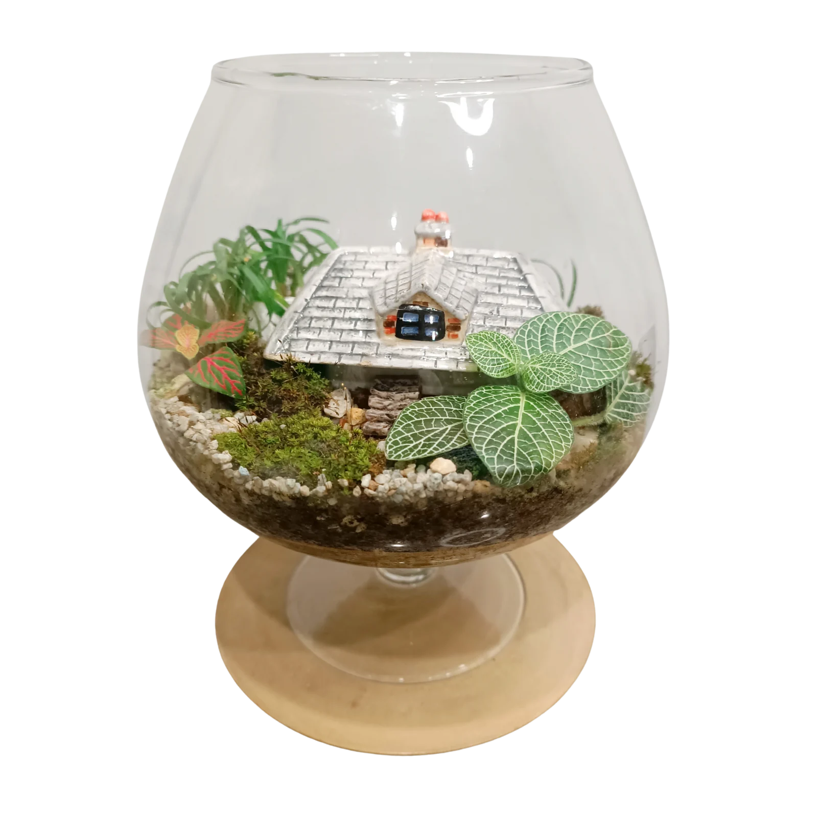 A charming glass terrarium showcasing a miniature cottage nestled among soft moss, delicate fittionia and layered pebbles creating a cozy, storybook landscape sealed in nature.