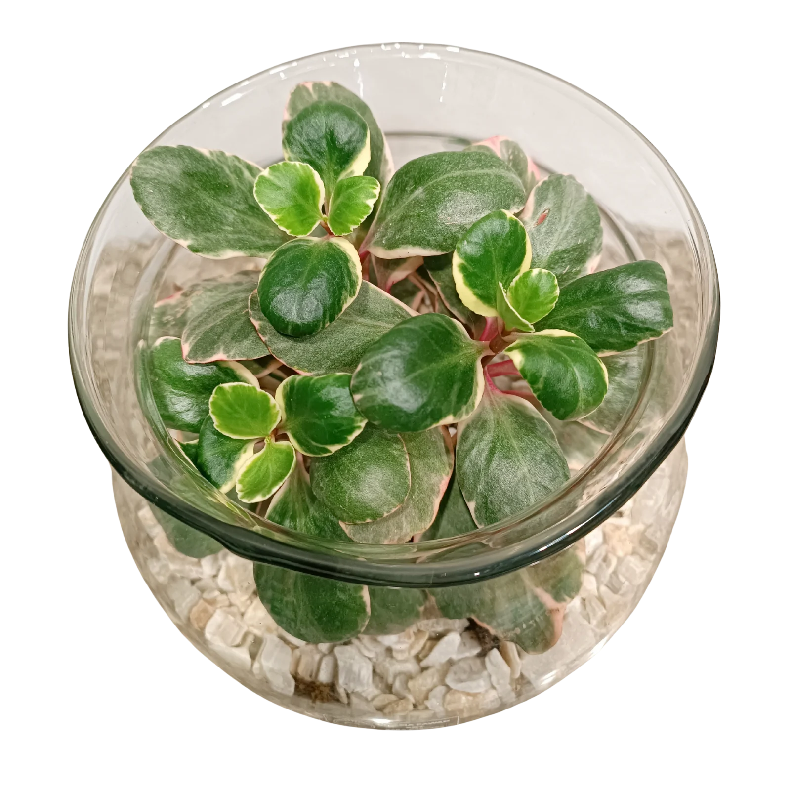 Kalanchoe Blossfeldiana in beautiful glass container with white gravels perfect for a central piece arrangements