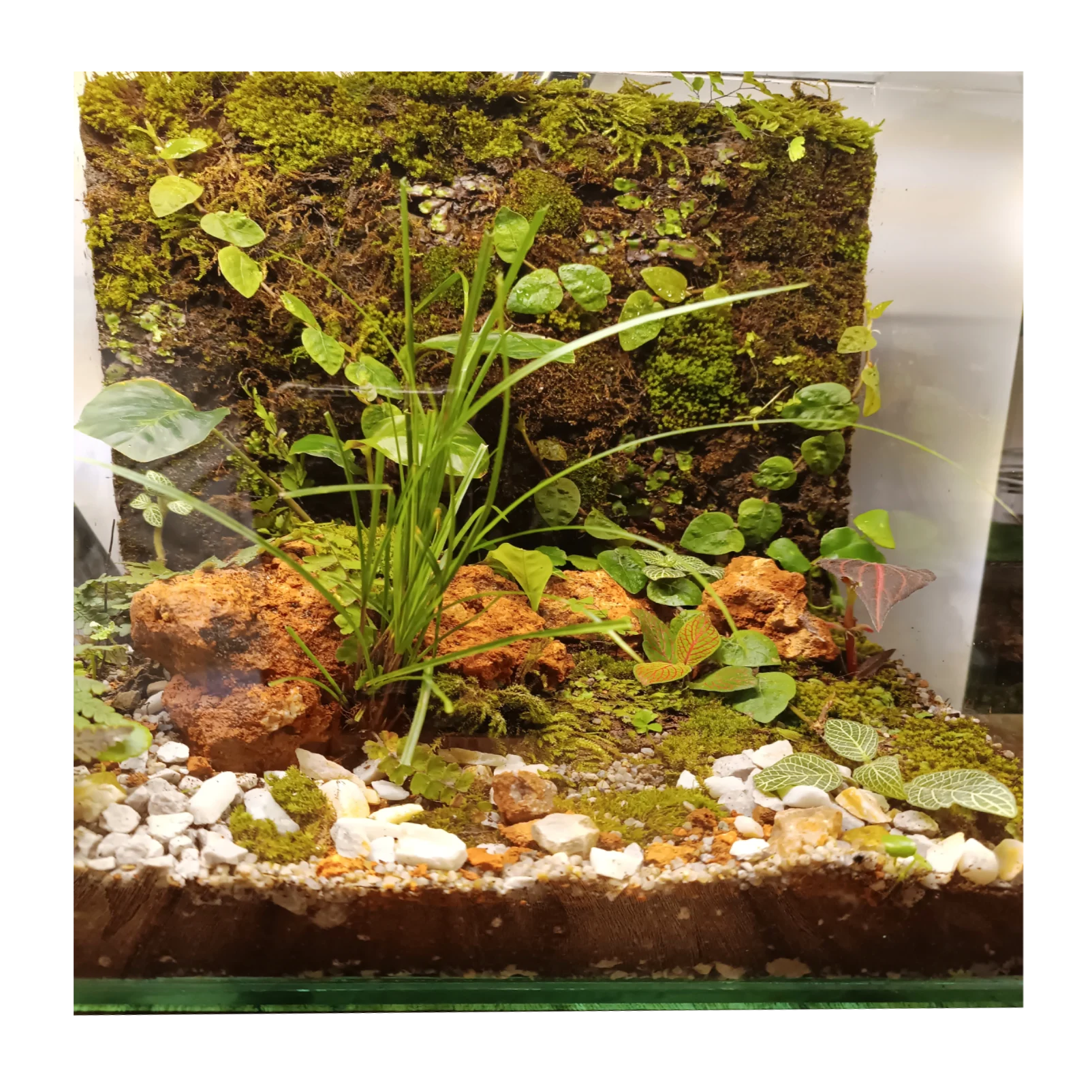 A wall covered with moss featuring hilly forest with natural landscape of foliage of wild grass, Ivy, Fern, Fittonia, PennyWort, Calathea and Coleus.