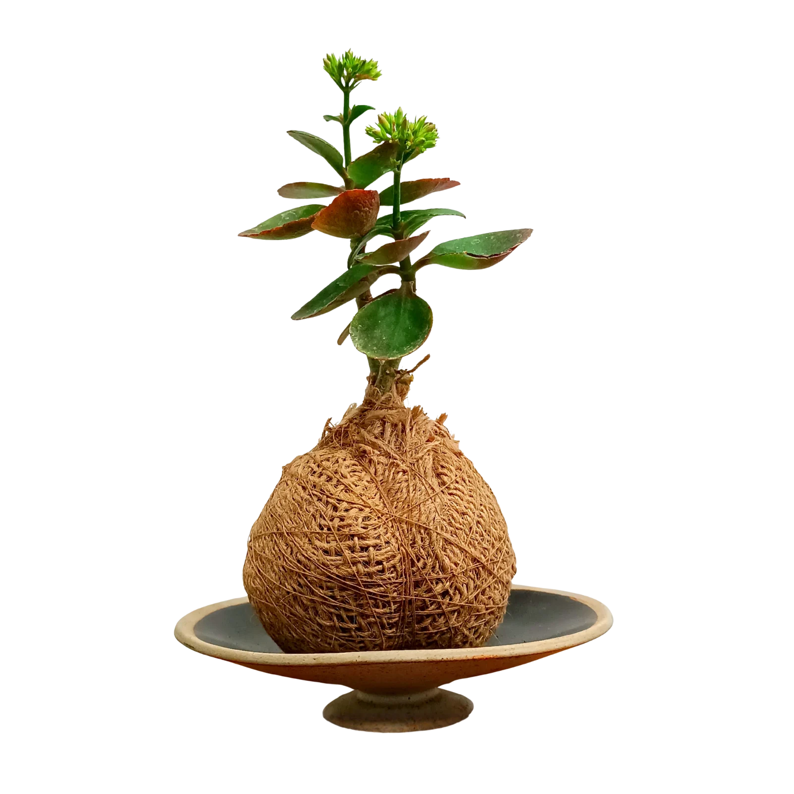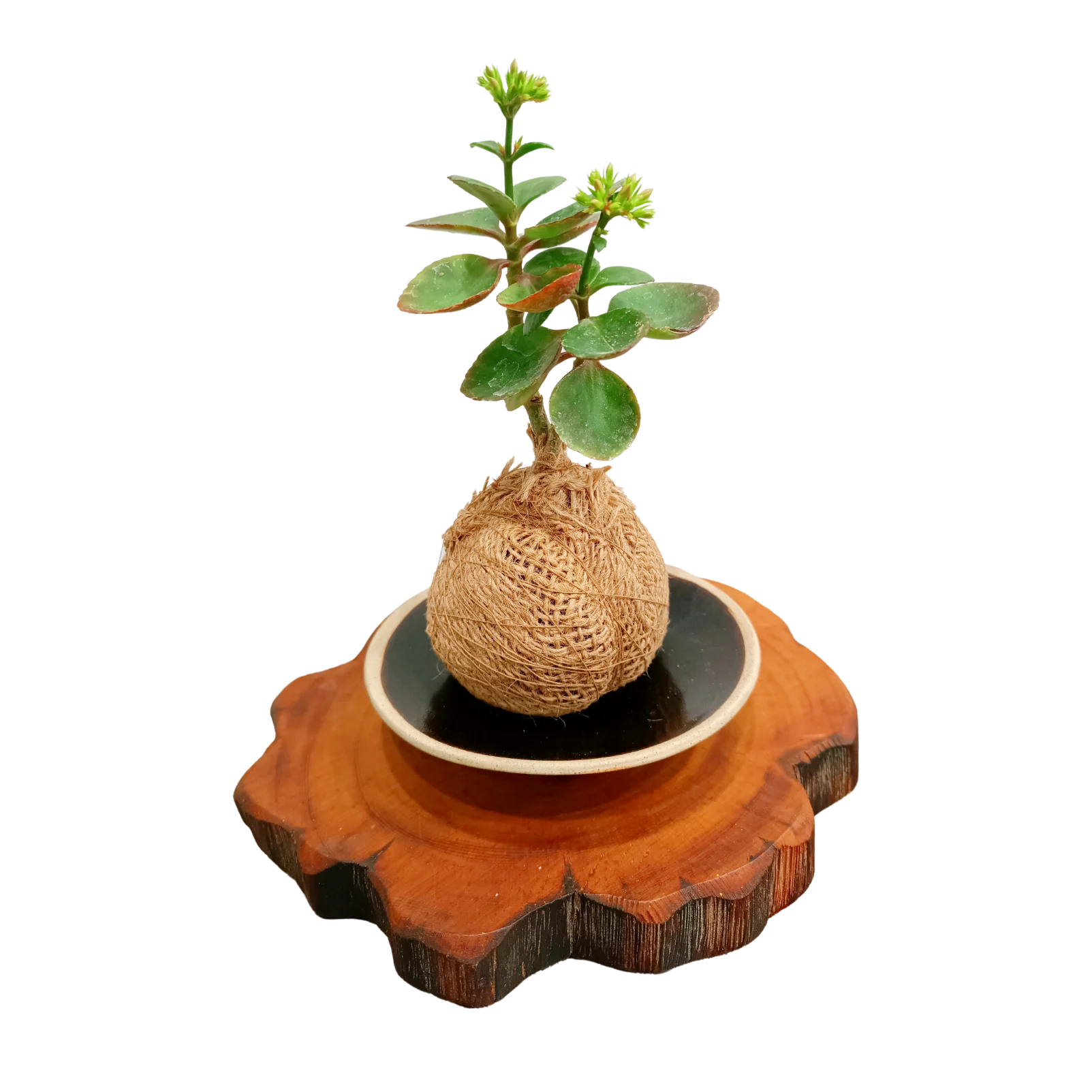 A small kokedama featuring succulent wrapped in natural fiber and balanced beautifully without a pot.its fresh green leaves and delicate buds soon about to bloom create a calm earthy accent.