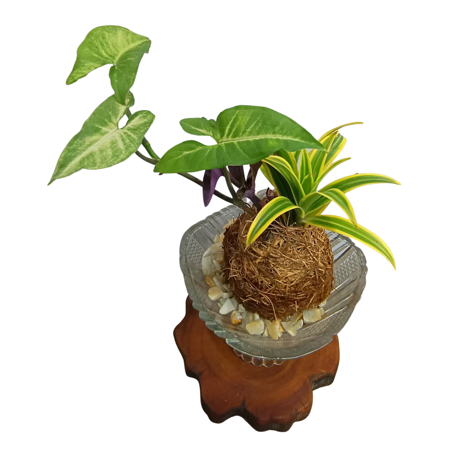 A handcrafted kokedama featuring foliage of Syngonium, indianplant Dracaena Reflexa, Tradescantia purple heart wrapped in nest fibers elegantly placed on a glass pedestal-blending earthy texture with a calm, modern botanical aesthetic .