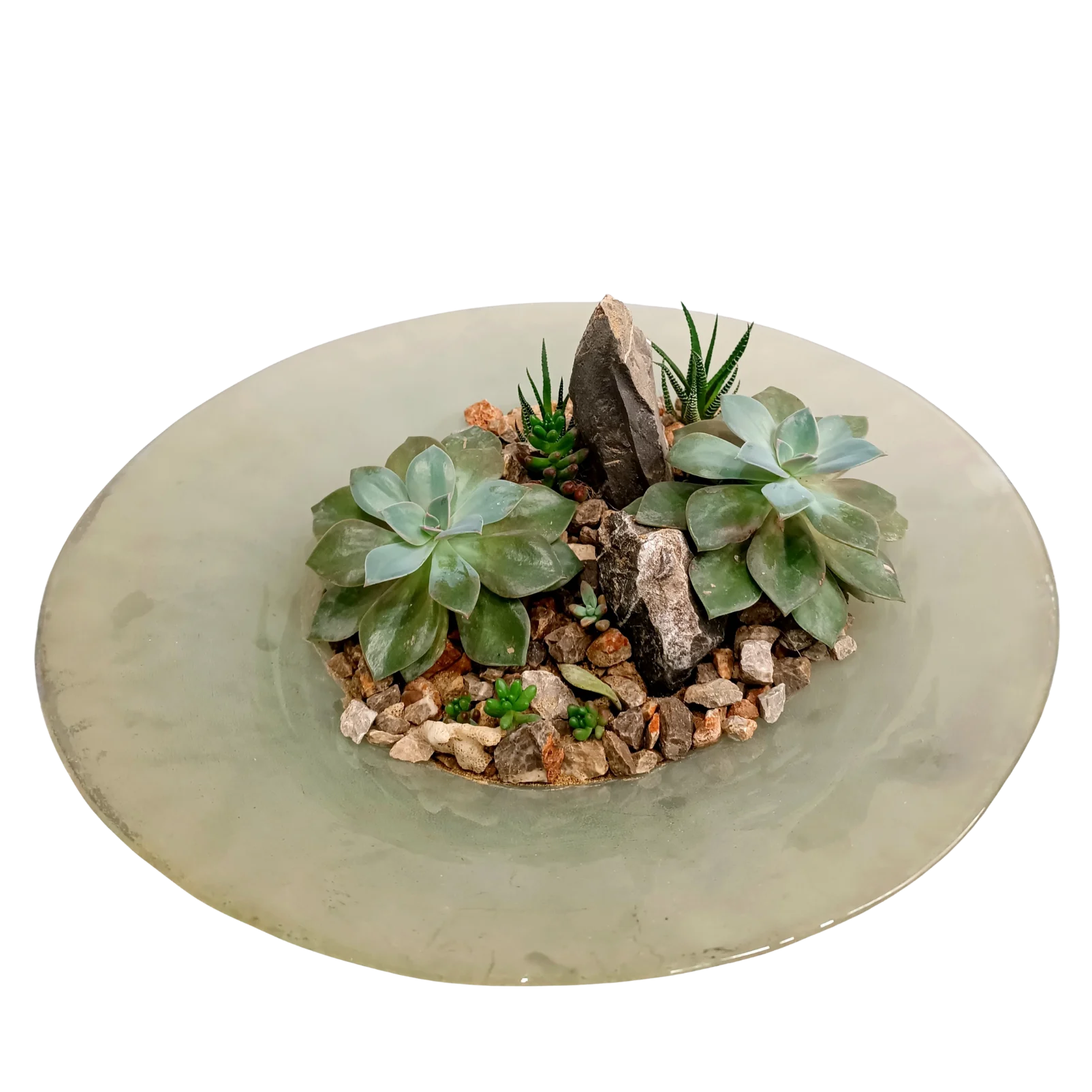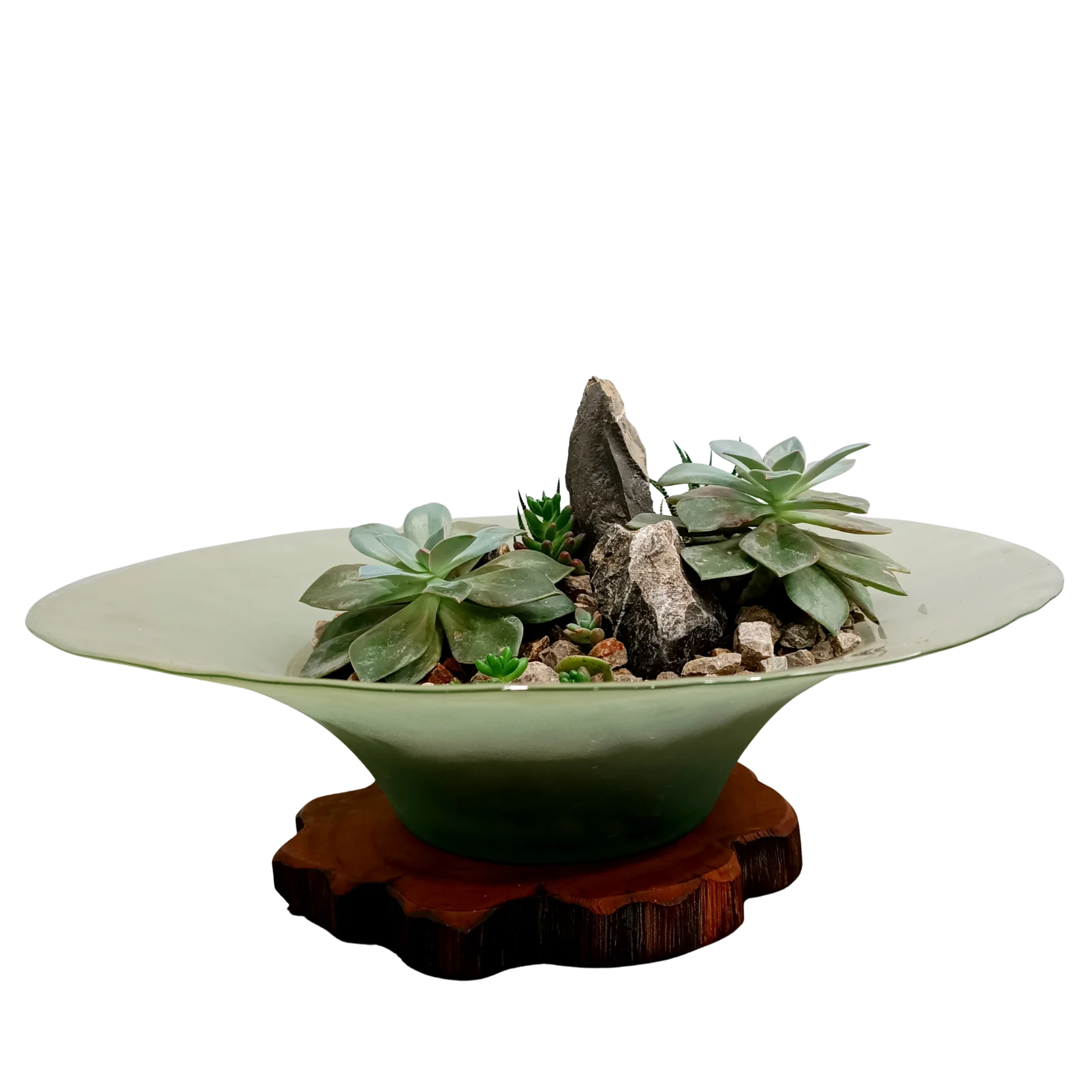 A minimalist succulent landscape set of Echeveria and Haworthia with stone into an open glass container